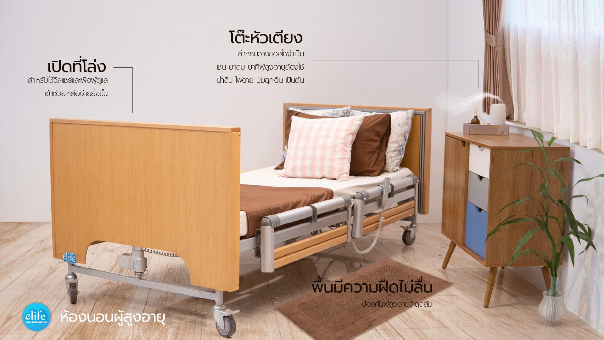 - เตียงนอนเลือกเป็น เตียงปรับไฟฟ้า เหตุผลว่าทำไม ? ถึงต้องใช้เตียงไฟฟ้าเตียงธรรมดาก็ใช้ได้เหมือนกัน เพราะเตียงปรับไฟฟ้าเป็นอุปกรณ์การแพทย์ที่ถูกออกแบบพิเศษสำหรับดูแลผู้สูงอายุและผู้ป่วยโดยเฉพาะ มีฟังก์ชันการใช้งานเหมือนกับเตียงผู้ป่วยในโรงพยาบาล ไม่ว่าจะเป็นการปรับระดับเพื่อนั่ง ชันเข่า ระดับสูง-ต่ำ เพื่อให้เหมาะกับการดูแลและอำนวยความสะดวกให้กับคนใช้งาน แต่ก็จะมีปัญหากับผู้สูงอายุหลายท่านที่ไม่ชอบลักษณะเตียงแบบโรงพยาบาลเพราะให้ความรู้สึกเหมือนตอกย้ำว่าเป็นคนป่วย วิสัยทัศน์เมื่อเอาไปวางในบ้านก็ไม่สวยงาม แต่ปัจจุบันมีการดีไซน์เตียงนอนไฟฟ้าให้เหมือนกับเตียงนอนทั่วไป โครงสร้างเป็นกรุไม้ ดูเป็นมิตรมากขึ้น จริงๆเตียงลักษณะนี้นิยมใช้ตามบ้านพักคนชราในประเทศญี่ปุ่น