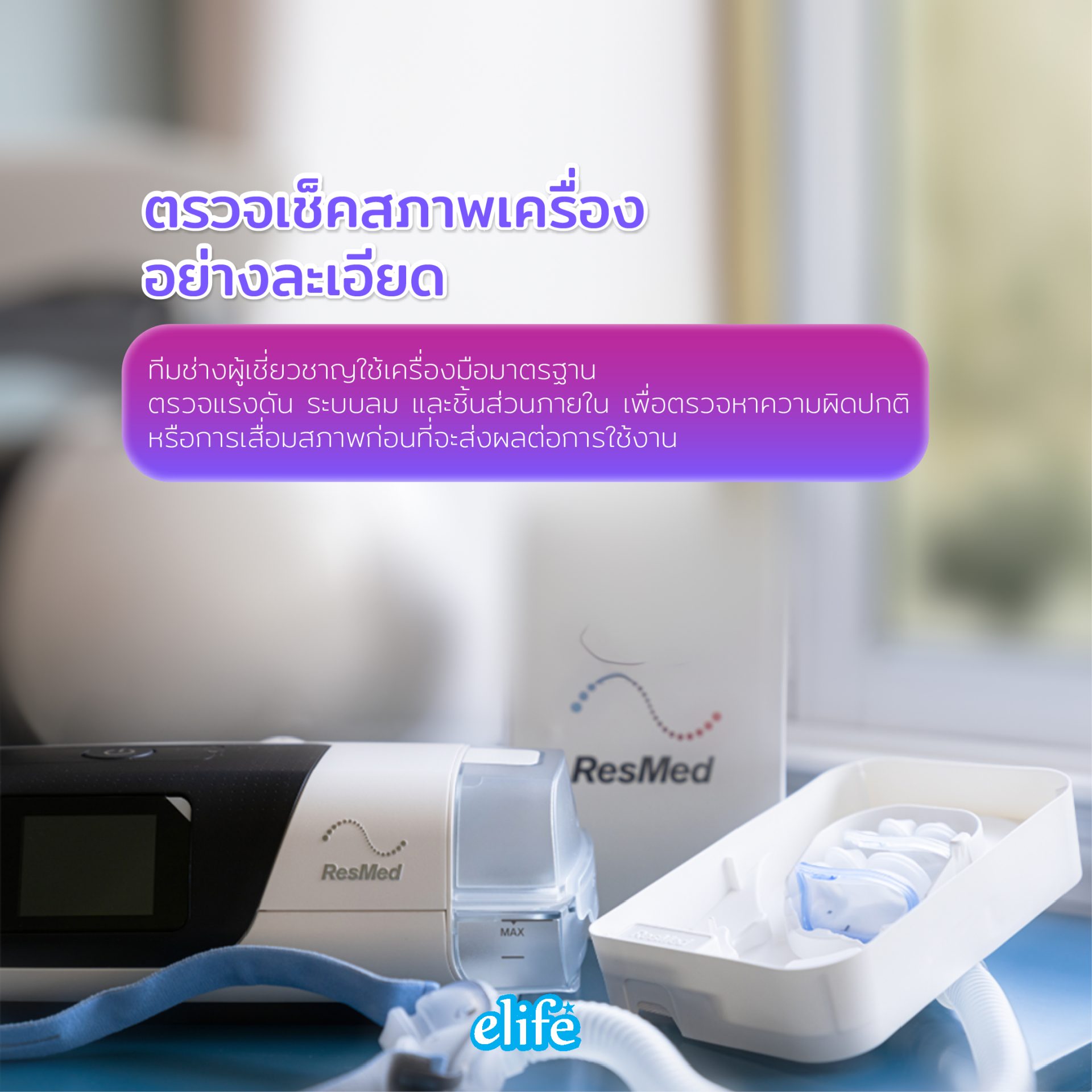 อีไลฟ์เป็น ASC (Authorized Service Center) โดยตรงจากทาง ResMed ทำให้คุณมั่นใจในการให้บริการครบวงจรทั้ง จำหน่าย, เชคสภาพ, ซ่อม