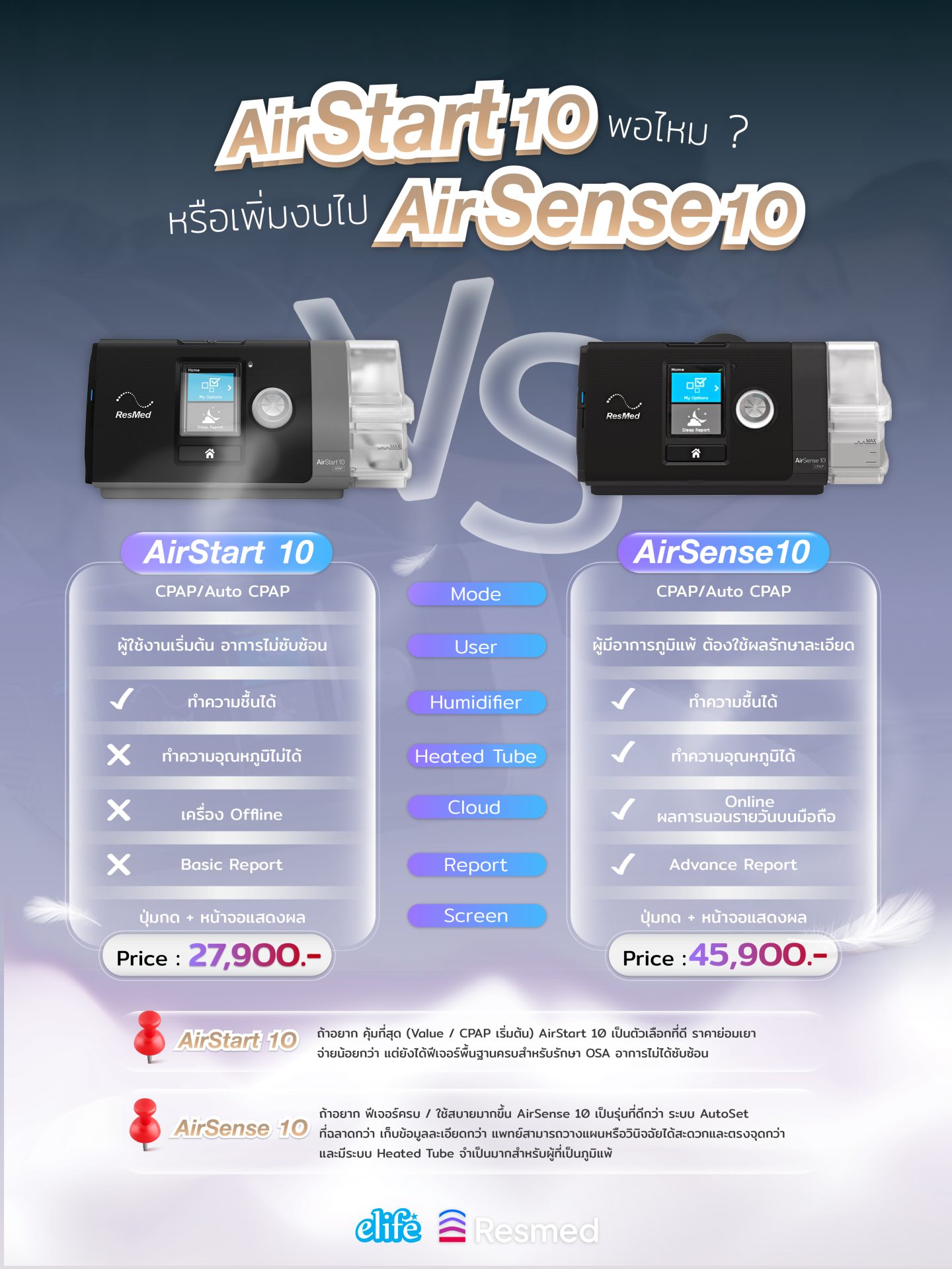 - ถ้าอยาก คุ้มที่สุด (Value / CPAP เริ่มต้น) AirStart 10 เป็นตัวเลือกที่ดี ราคาย่อมเยา จ่ายน้อยกว่า แต่ยังได้ฟีเจอร์พื้นฐานครบสำหรับรักษา OSA อาการไม่ได้ซับซ้อน