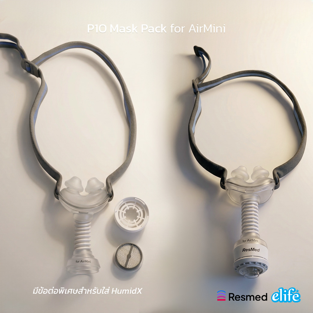 P10 MaskPack For AirMini เป็นหน้ากาก Pillow เฉพาะใช้กับเครื่อง Airmini เท่านั้น ในกล่องจะประกอบด้วยหน้ากาก และซิลิโคนรองใต้จมูก 3 ขนาดเหมือนกับ Airfit P10 แต่ที่ต่างกันคือตัวท่อของ P10 For Airimini จะมีช่องสำหรับใส่ HumidX สำหรับทำความชื้นดังนั้นจึงไม่สามารถใช้ร่วมกับ CPAP รุ่นอื่น ๆ ได้ ในชุดมีอะไรบ้าง? P10 MaskPack (หรือ Setup Pack) จะไม่ได้มีแค่หน้ากากนะ แต่จะเป็น “ชุดครบ” เช่น